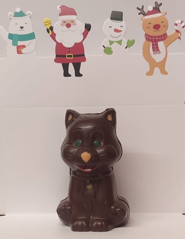 Moulage chat en chocolat noir, lait ou blanc décoré.